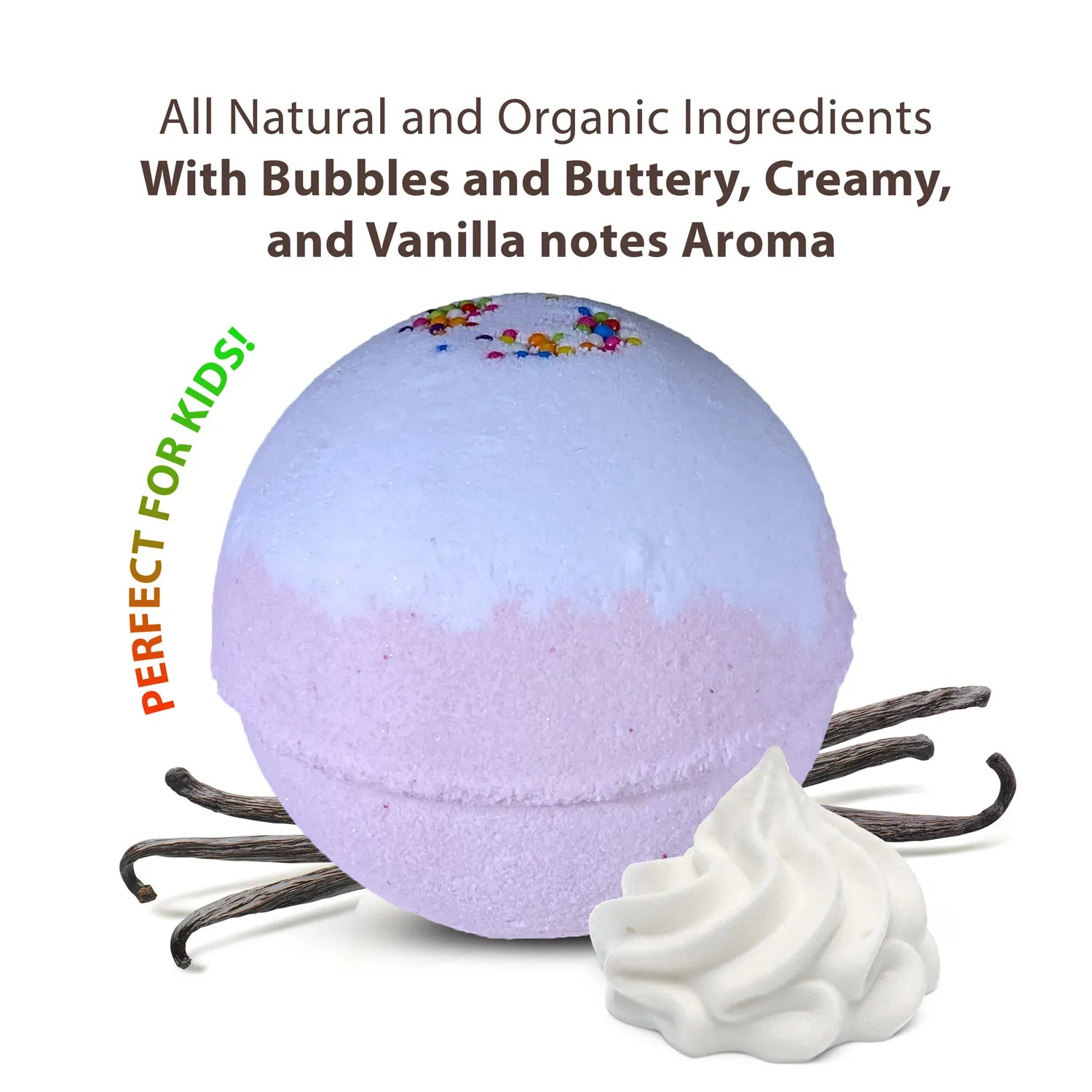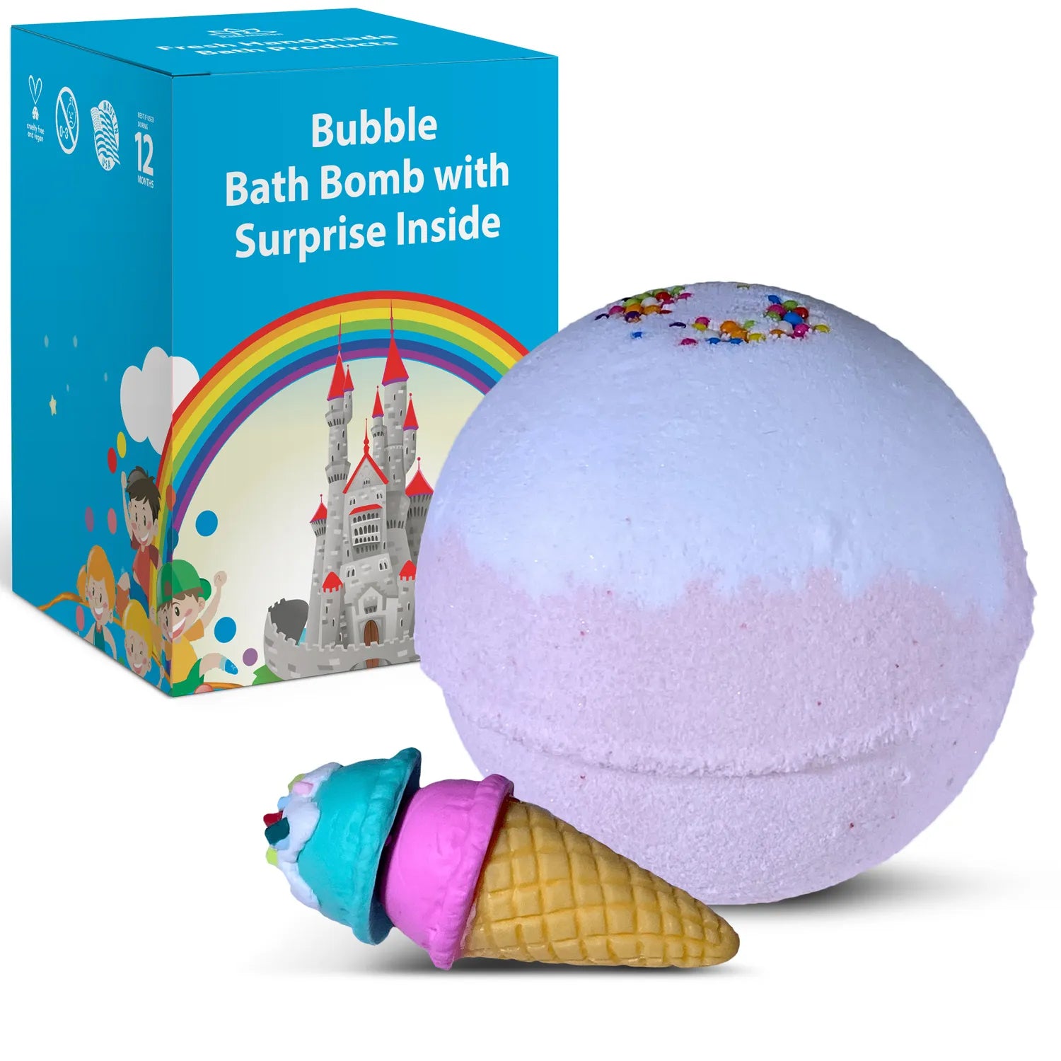 - 1 BATH BOMB WITH TOY INSIDE: “ICE CREAM” toy inside in our Handmade Bath Bomb gives REALLY FUN Bath Time For Kids. Your KIDS will LOVE “BIRTHDAY CAKE” Scent, a lot of Fizzes and Bubbles and a surprise toy inside.