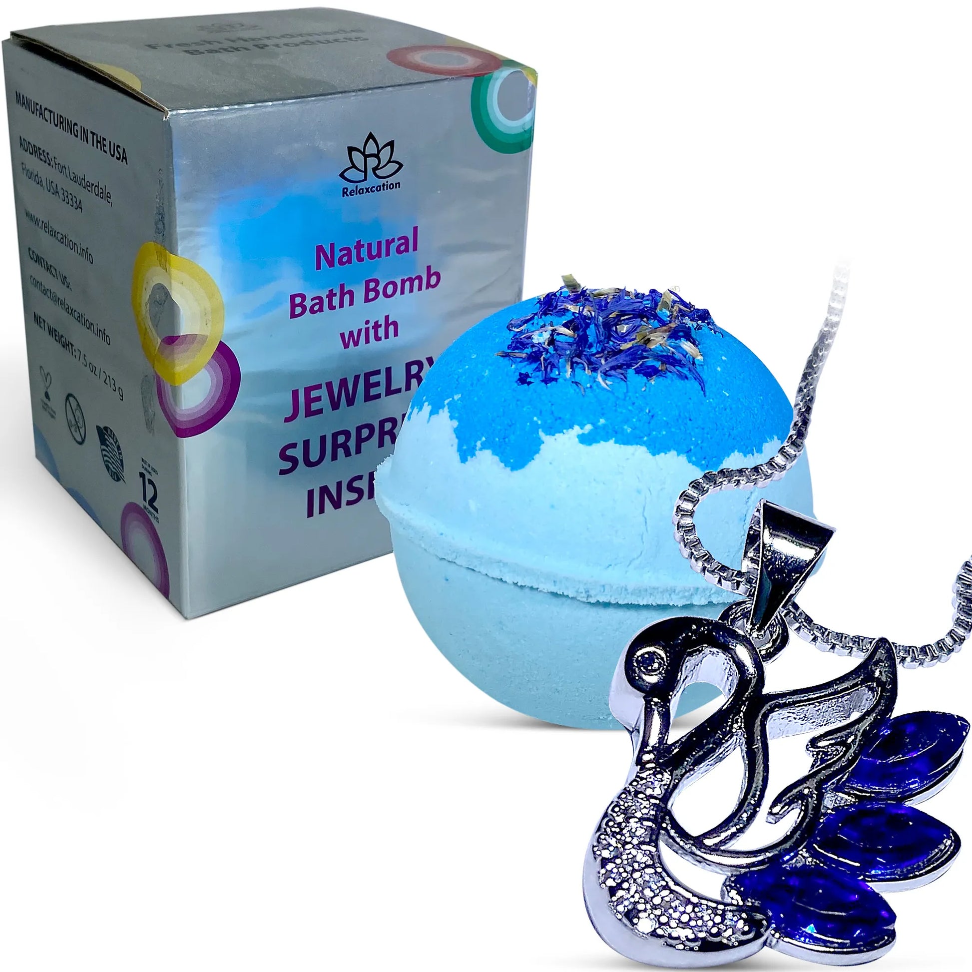 - 1 BATH BOMB WITH SURPRISE INSIDE – Bath bombs are nothing new these days but when the necklace appeared, that’s something different. Ultra-relaxing and fizzy blue bath bomb with surprise inside Swan jewelry necklace, making it perfect for Mother’s Day and Father’s Day gifts, birthday gift, spa/bath gifts for the special one, perfect gifts for the women you love: mom, wife, girlfriend, and even yourself!