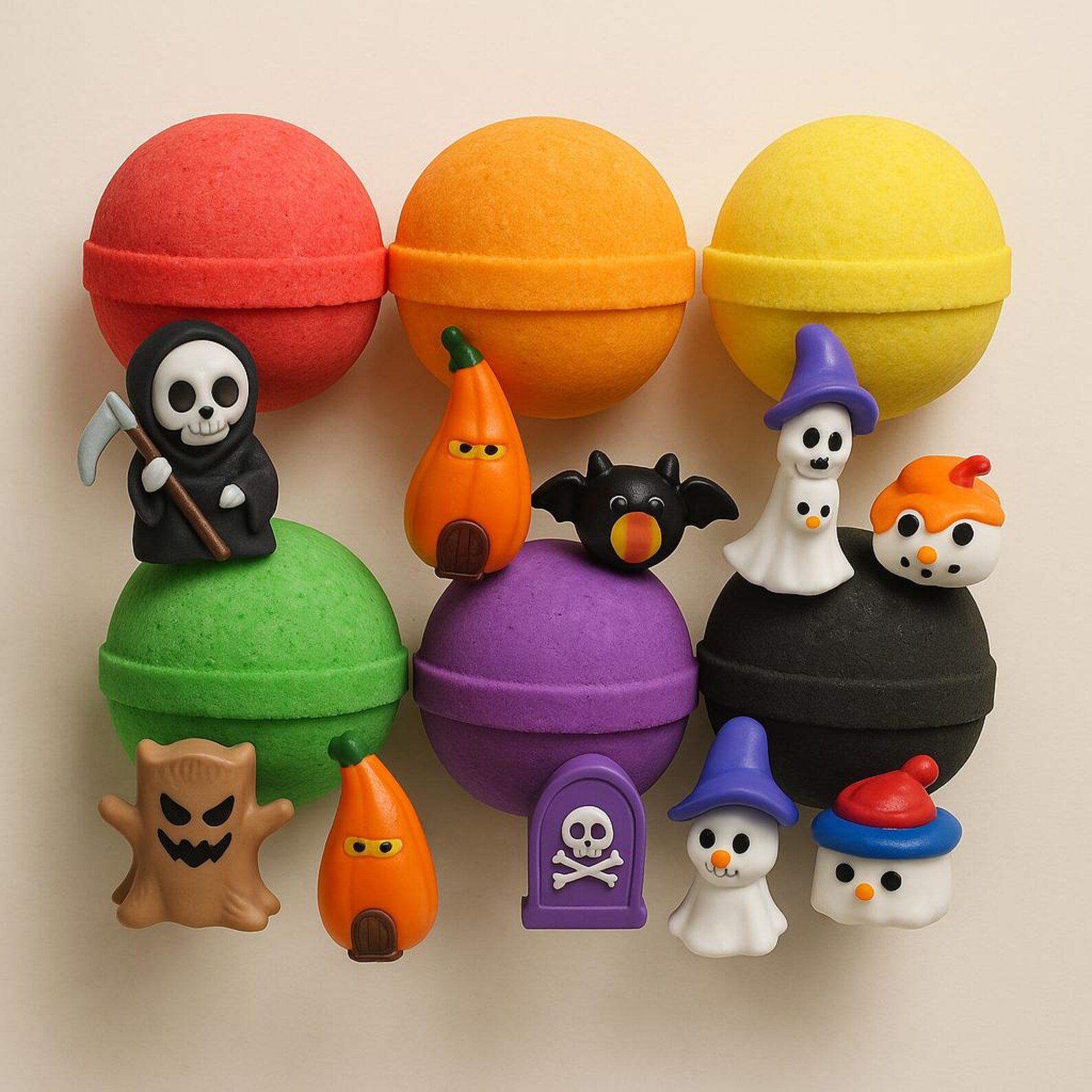 Make bath time magical and fun this Halloween! Each of our 6 natural bath bombs hides a random spooky Halloween toy inside, delighting kids as the fizz reveals a surprise. Perfect for boys and girls, these bombs combine playful excitement with gentle skincare.