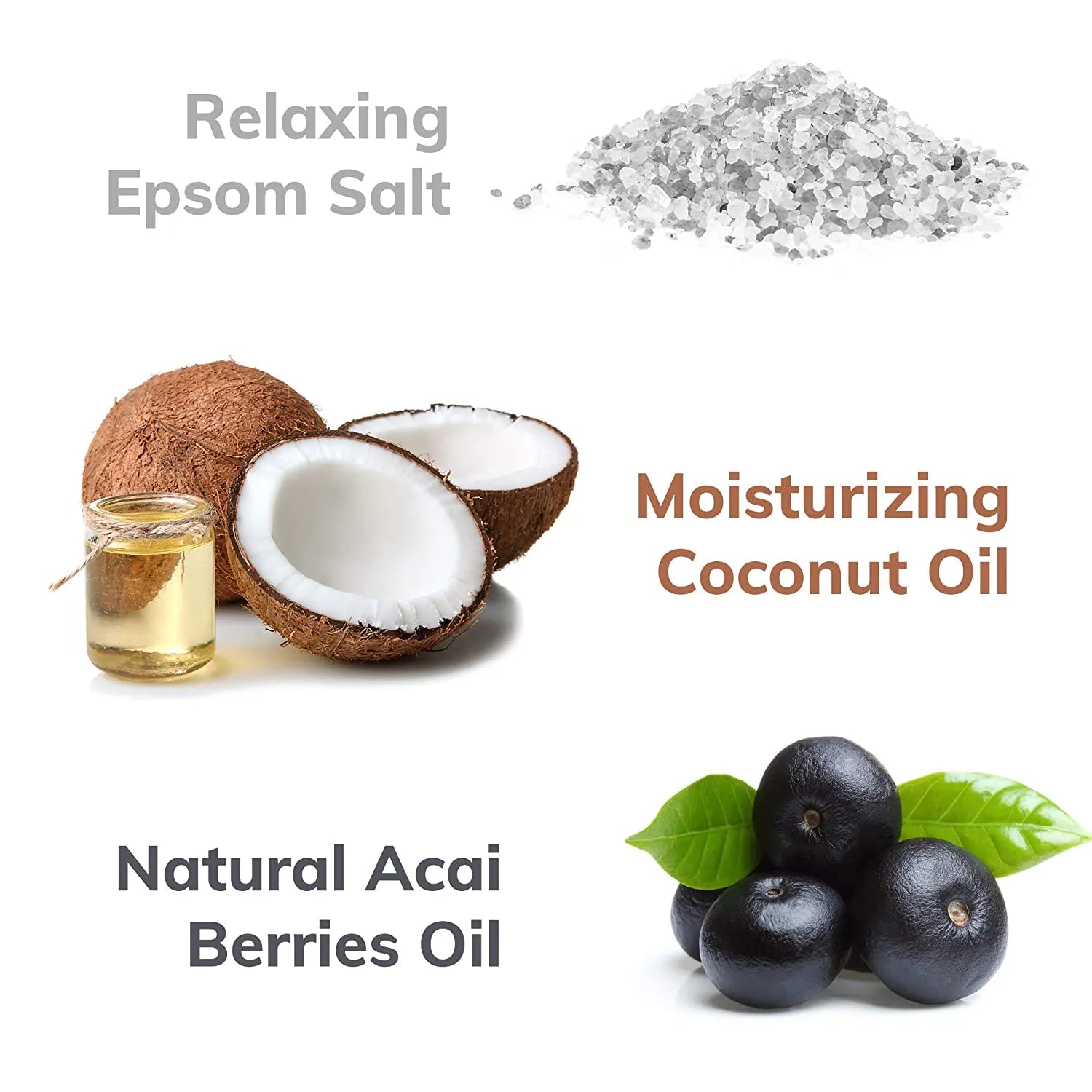 - RICH WITH ESSENTIAL OILS - You'll feel like you're soaking in serenity with this heavenly combination of Essential Oils, Epsom Salt, Dead Sea Salt, Himalayan Salt, Kaolin Clay, Coconut Oil, Olive Oil for Moisturizing, Acai Berries Natural Oil for Relaxation that moisturizes and replenishes your skin leaving it feeling amazing.