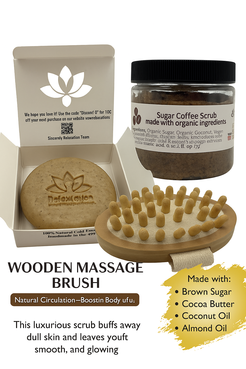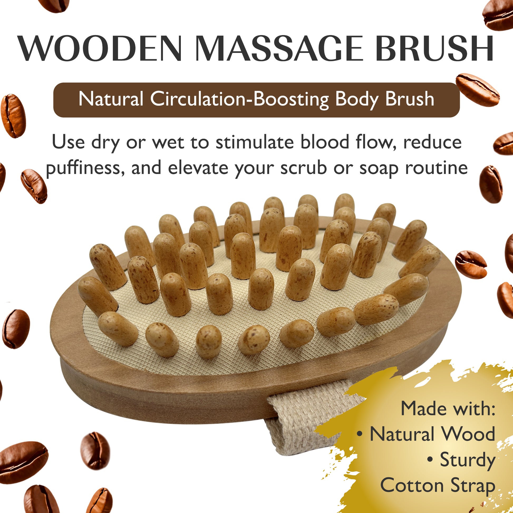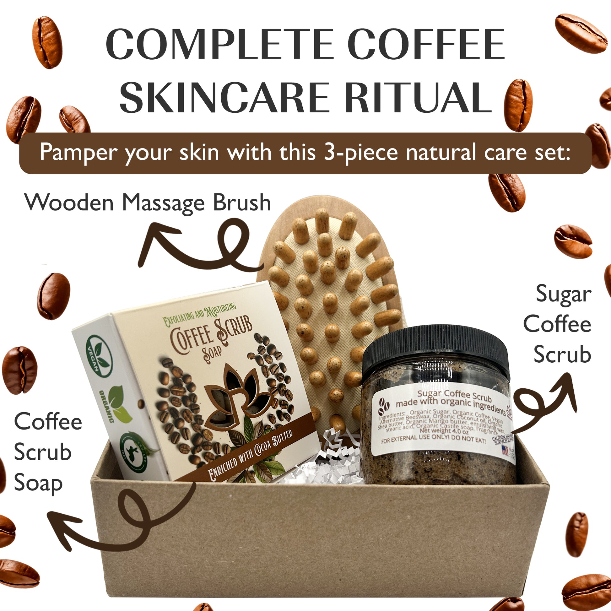 Coffee Gift Set - Coffee Scrub 4 oz, Natural Coffee Soap + Wooden Body Massager Brush