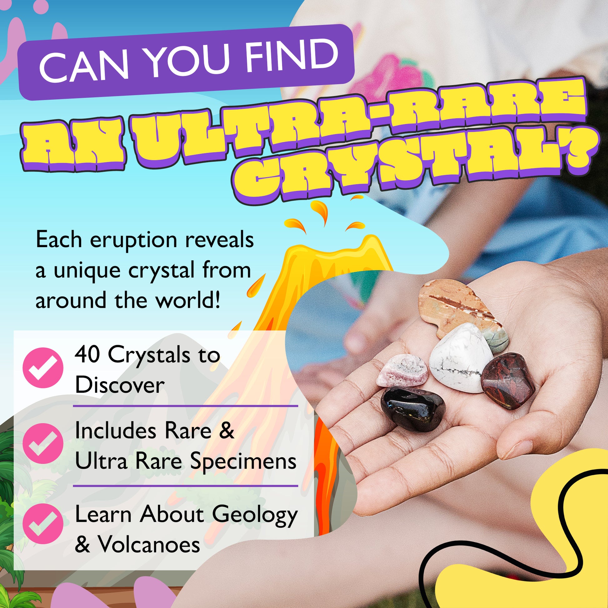 Collect them all â 40 different crystals and volcano names to discover!