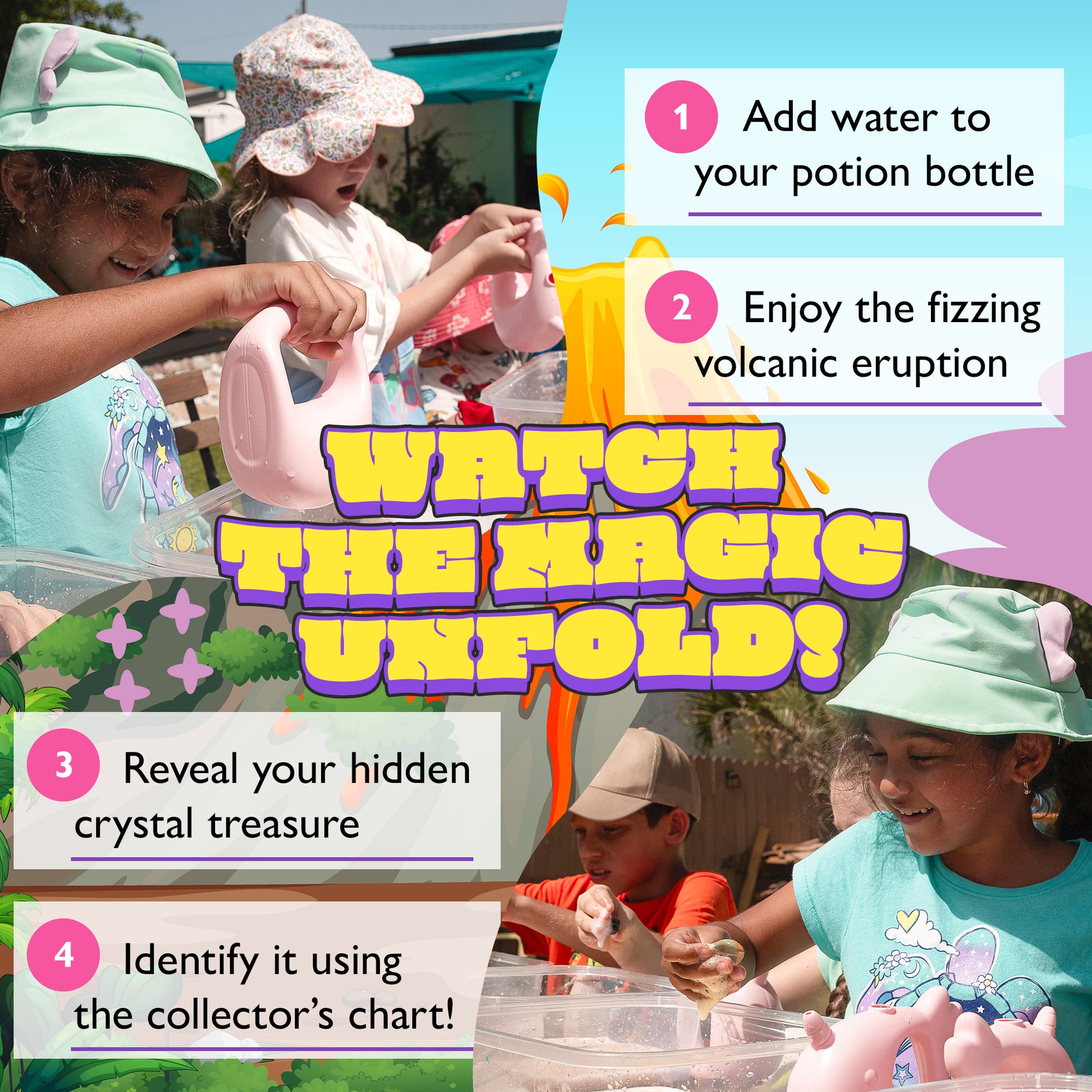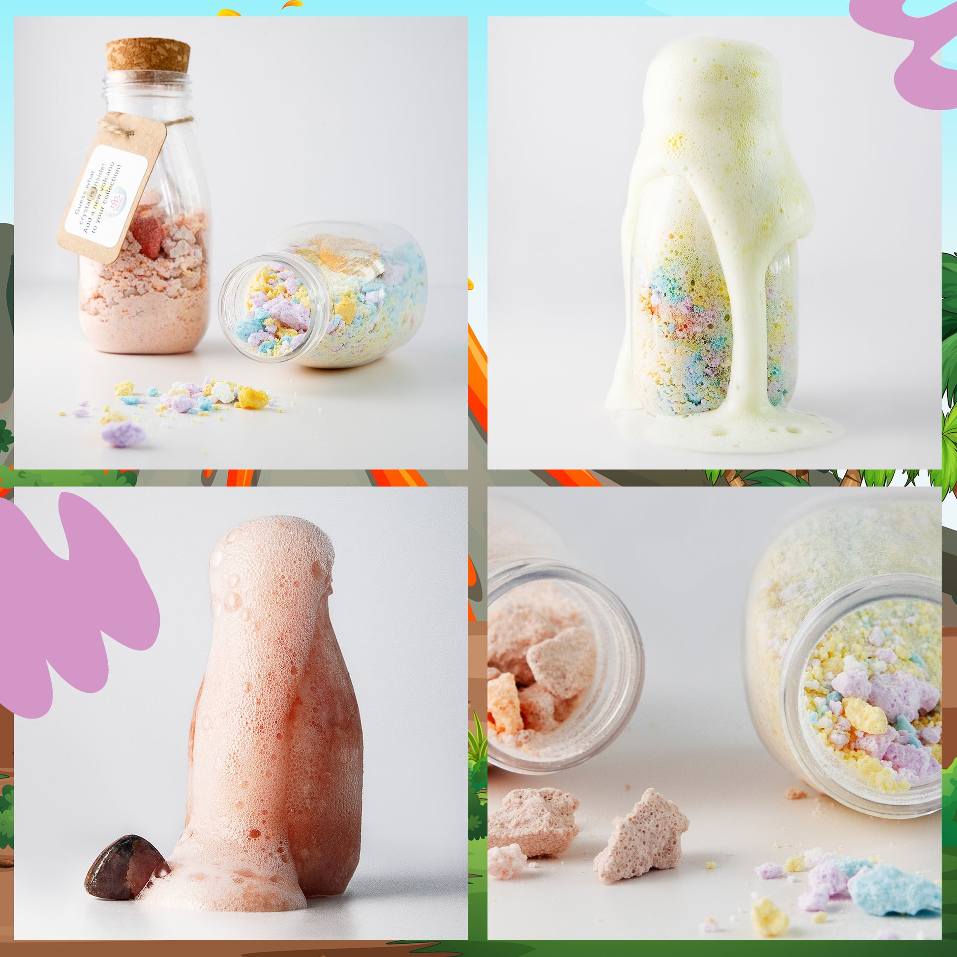 Unleash a bubbling eruption and discover a hidden crystal inside! Each Volcano Crystal Potion is packed with fizzy fun and science-inspired magic. Just add water, watch your potion fizz and flow like lava â and reveal a shiny gemstone surprise!