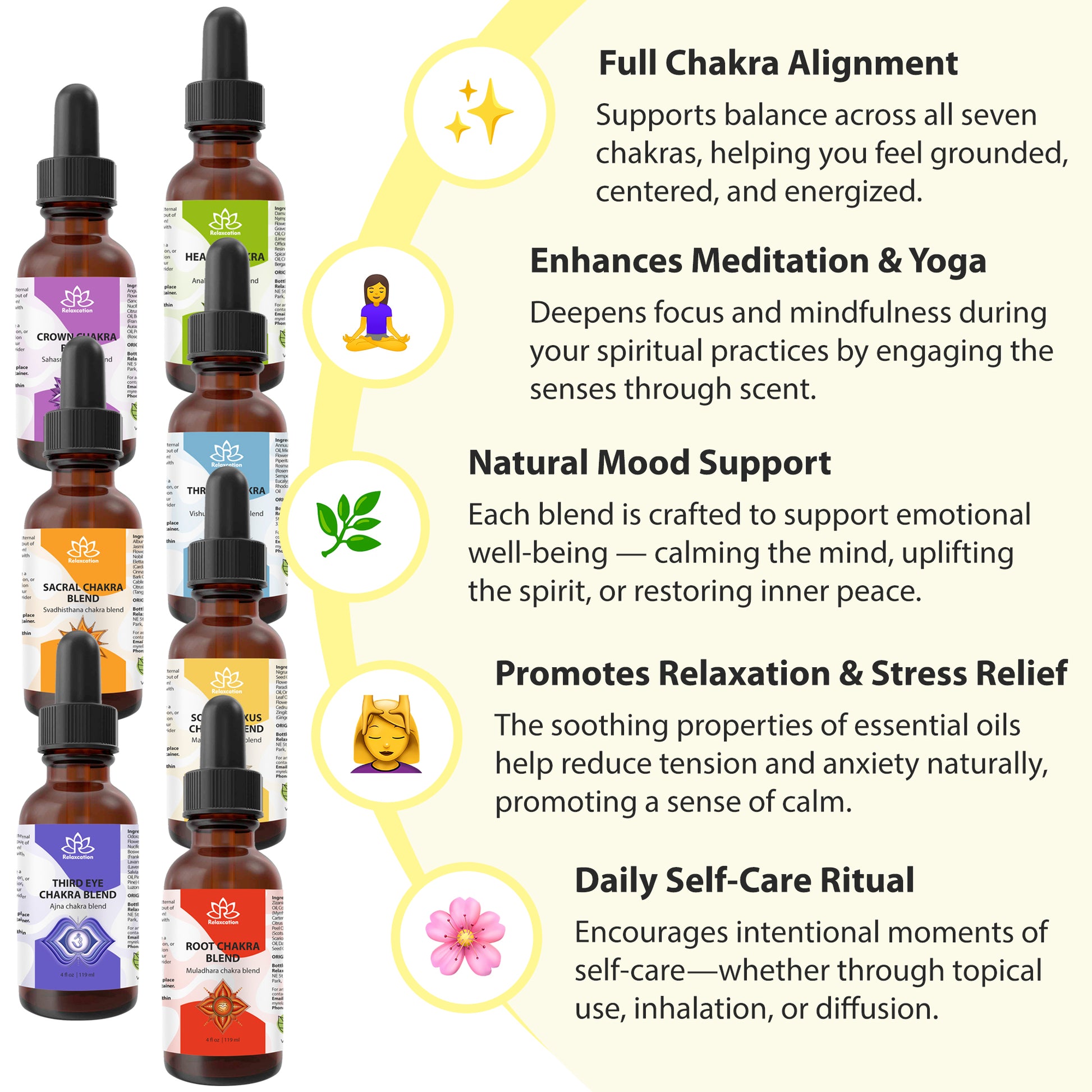 Diffuse, dilute for topical use, or incorporate into your daily wellness practice to support each chakra's energy flow.