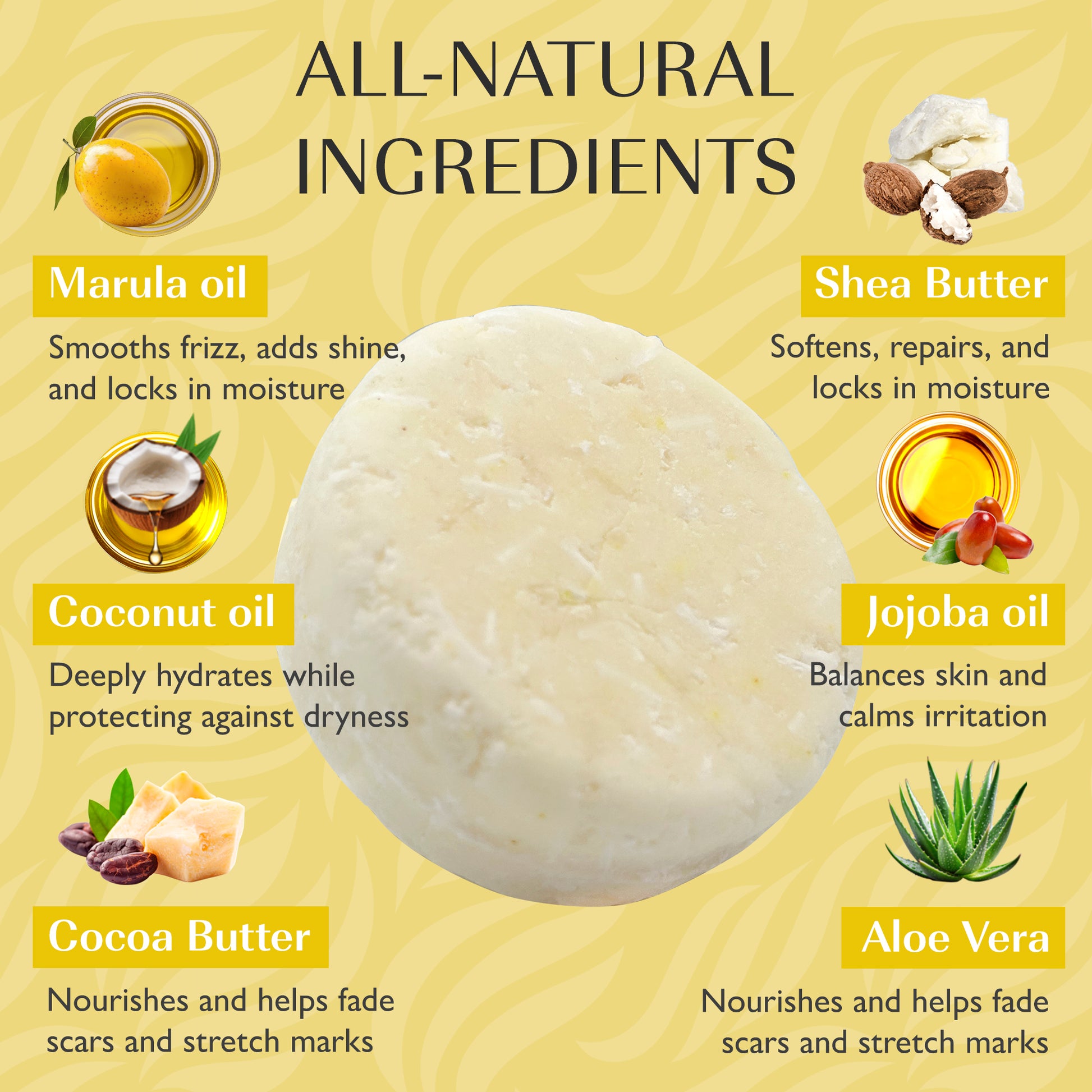 Our shampoo bars combine nourishing marula oil, shea butter, coconut oil, cocoa butter, and aloe vera to offer a gentle, plant based cleansing experience.