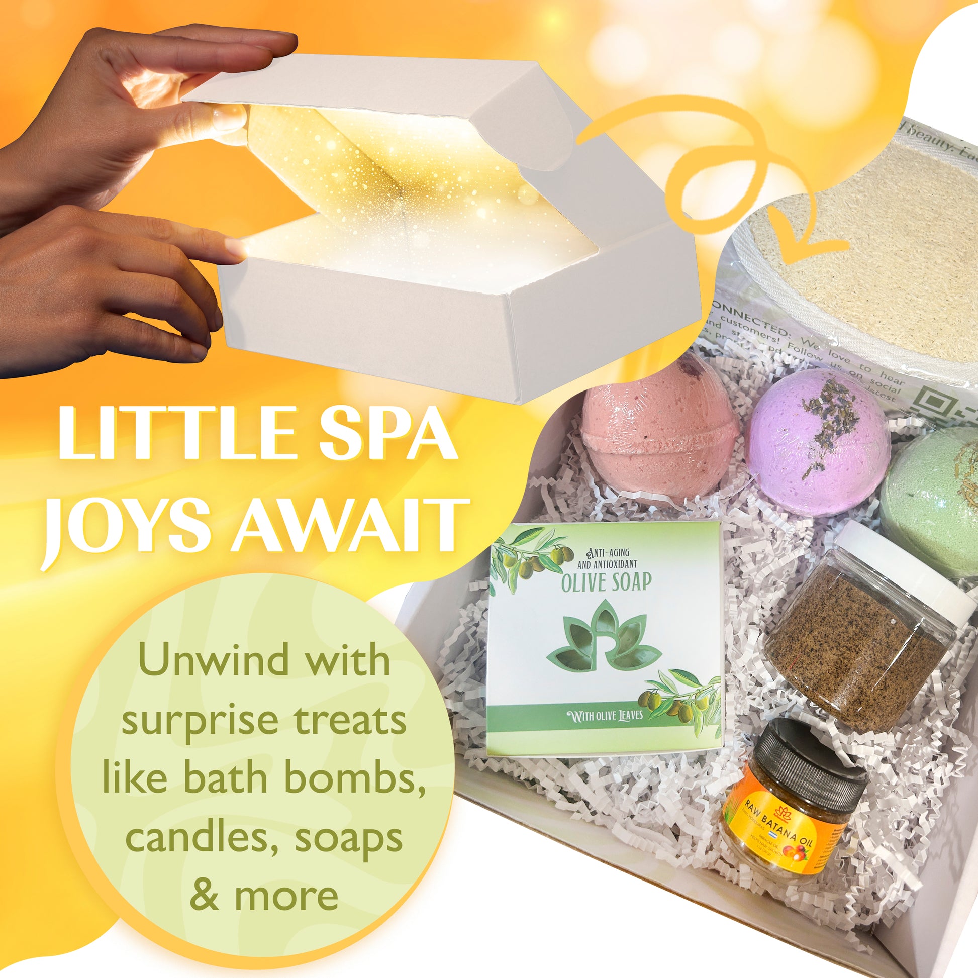Treat yourself or someone special with our curated Mystery Gift Set for Her. Each box is thoughtfully filled with self-care favorites — from luxurious bath treats and scented candles to pampering skincare and surprise extras. (bath bombs, soap, candles, scrubs, shampoo bars, shower steamers, face oils)