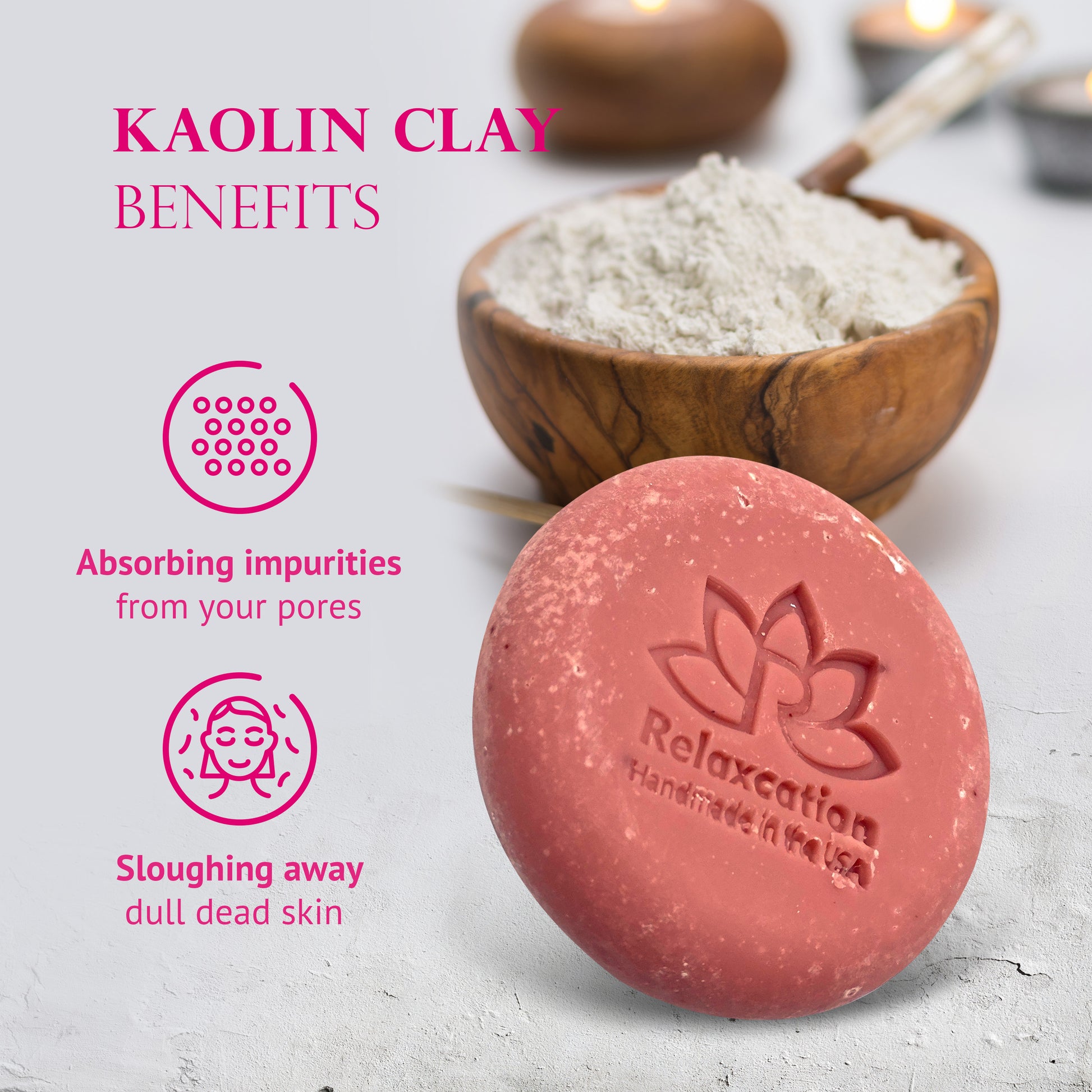 - KAOLIN CLAY - Kaolin clay is known for its ability to absorb excess oils from the skin, making it ideal for oily skin types. Combined with rose petals, this soap offers a luxurious experience that will leave your skin feeling soft and silky.
